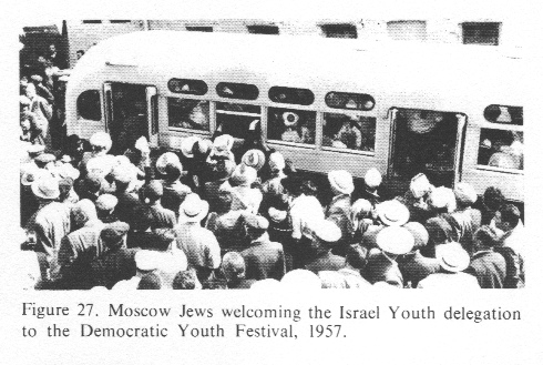 Encyclopaedia Judaica (1971): Russia: Jews in "Soviet Union", vol.14, col. 490, Moscow Jews welcoming the Israel Youth delegation to the Democratic Youth Festival, 1957