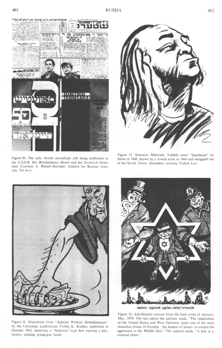 Anti-Semitism remained officially proscribed in the Soviet Union, but hatred of Jews existed and expressed itself de facto in most levels of society and administration. From time to time it (col. 487)