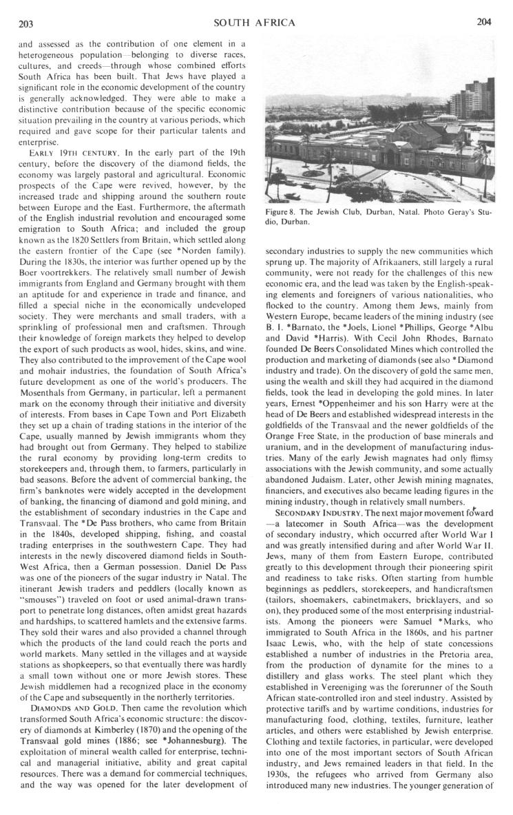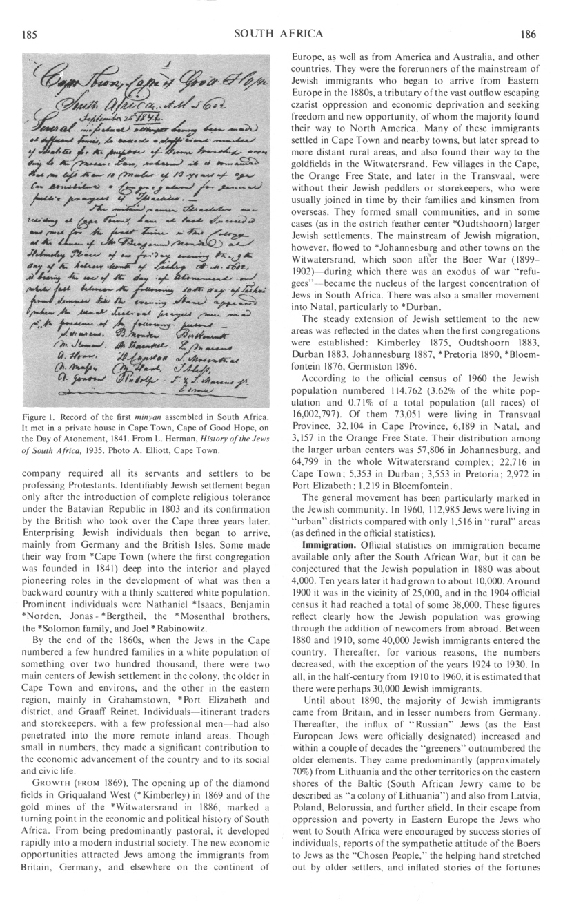 Identifiably Jewish settlement began only after the introduction of complete religious tolerance under the Batavian Republic in 1803 and its confirmation by the British who took over the Cape three years later. Enterprising Jewish individuals then began to arrive, mainly from Germany and the British Isles. Some made their way from *Cape Town (where the first congregation was founded in 1841) deep into the interior and played pioneering roles in the development of what was then a backward country with a thinly scattered white population. Prominent individuals were Nathaniel *Isaacs, Benjamin *Norden, Jonas *Bergtheil, the *Mosenthal brothers, the *Solomon family, and Joel *Rabinowitz.