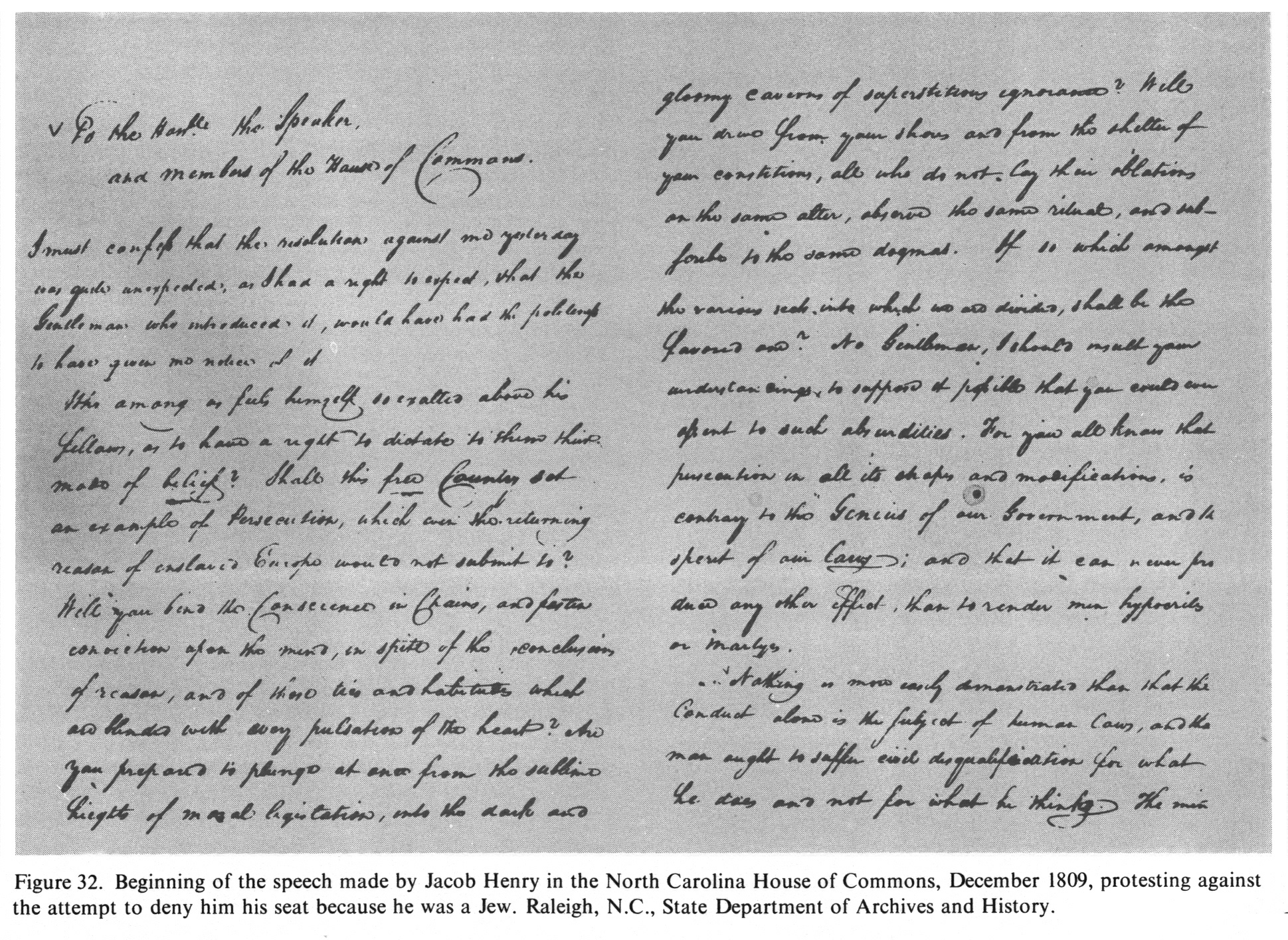 Still, there were occasional outbursts of anti-Semitism. The political strife between Federalists and Republicans at the turn of the 19th century produced a noticeable outpouring of slurs upon Jews who were Jeffersonian partisans. A Federalist in New York condemned the local Democratic-Republican Society by saying that they all seemed to be "of the tribe of Shylock". In 1809 Jacob *Henry was at first refused a seat in the North Carolina House of Commons to which he had been elected, but was eventually seated by a legal subterfuge.