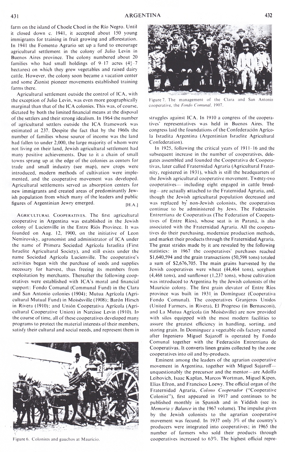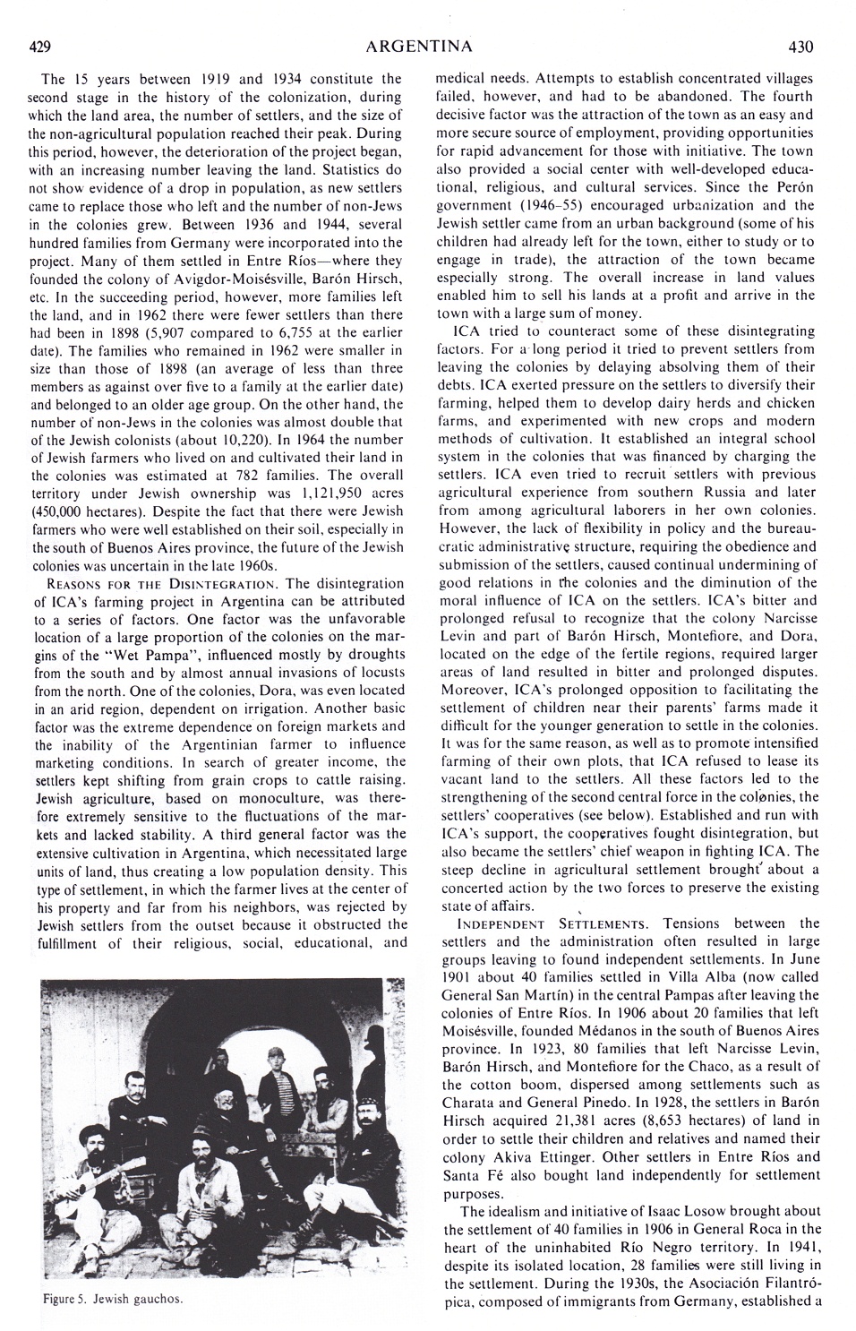 Die Anzahl Personen, die auf dem Land siedelten, erreichte während dieser Zeit 18.900, und bis 1925 stieg die Zahl nur um 1428 Personen auf 20.382 Personen an [[weil ab 1918 Palästina das Hauptziel der rassistisch-zionistischen Auswanderung war]]. Auch während dieser Zeit wurde die Mehrzahl der Kooperativen in den Kolonien eingerichtet, und Alberto *Gerchunoff schrieb sein klassisches Werk, Los Gauchos Judíos [[Die jüdischen Grossbauern]].> (Kol. 428)