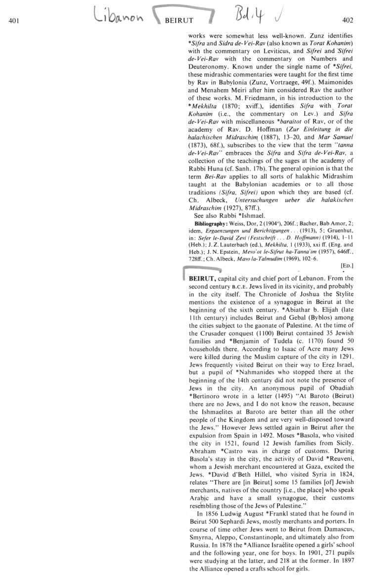 Encyclopaedia Judaica 1971: Beirut, vol. 4, col. 402