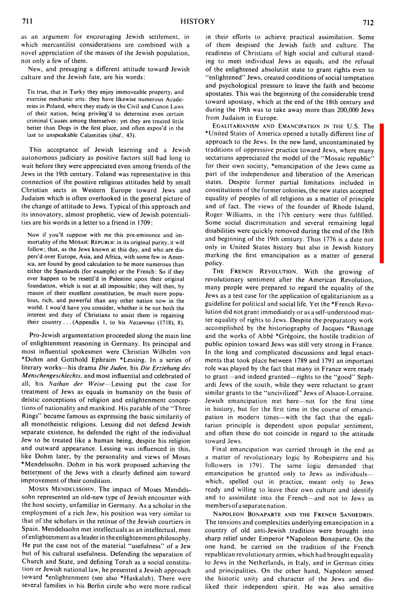 The *United States of America opened a totally different line of approach to the Jews. In the new land, uncontaminated by traditions of oppressive practice toward Jews, where many sectarians appreciated the model of the "Mosaic republic" for their own society, *emancipation of the Jews came as part of the independence and liberation of the American states. Despite former partial limitations included in constitutions of the former colonies, the new states accepted equality of peoples of all religions as a matter of principle and of fact. The views of the founder of Rhode Island, Roger Williams, in the 17th century were thus fulfilled. Some social discrimination and several remaining legal disabilities were quickly removed during the end of the 18th and beginning of the 19th century. Thus 1776 is a date not only in United States history but also in Jewish history marking the first emancipation as a matter of general policy.> (col. 712)