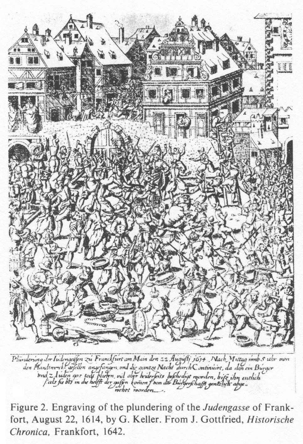 Trading center Frankfort - riots - royal pardon - Black Death destruction - "Jewish street" ghetto since 1462 - Fettmilch riots of 1614 - readmittance under harsh living conditions since 1616