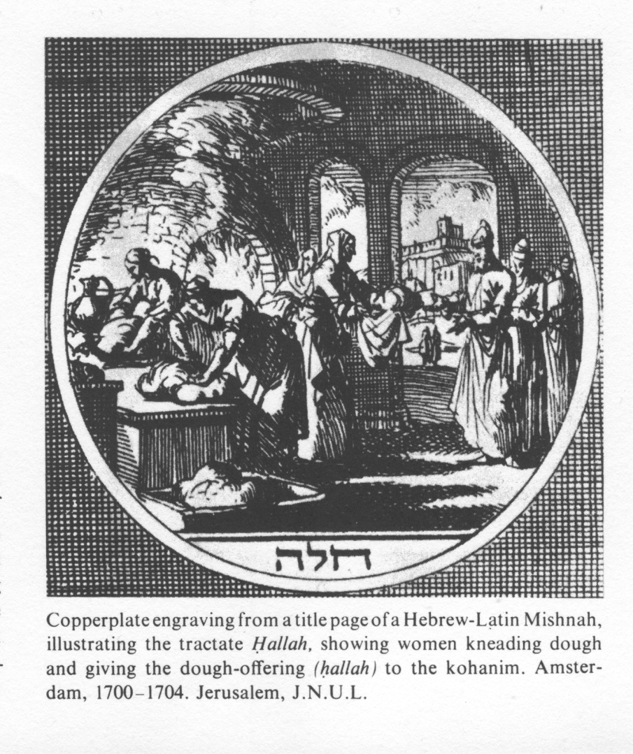 Encyclopaedia Judaica (1971): Halle, vol. 7, col. 1196. Copperplate engraving from a title page of a Hebrew-Latin Mishnah, illustrating the tractate "Hallah", showing women kneading dough and giving the dough-offering (hallah) to the kohanim [[priestly families]]. Amsterdam, 1700-1704. Jerusalem, J.N.U.L.