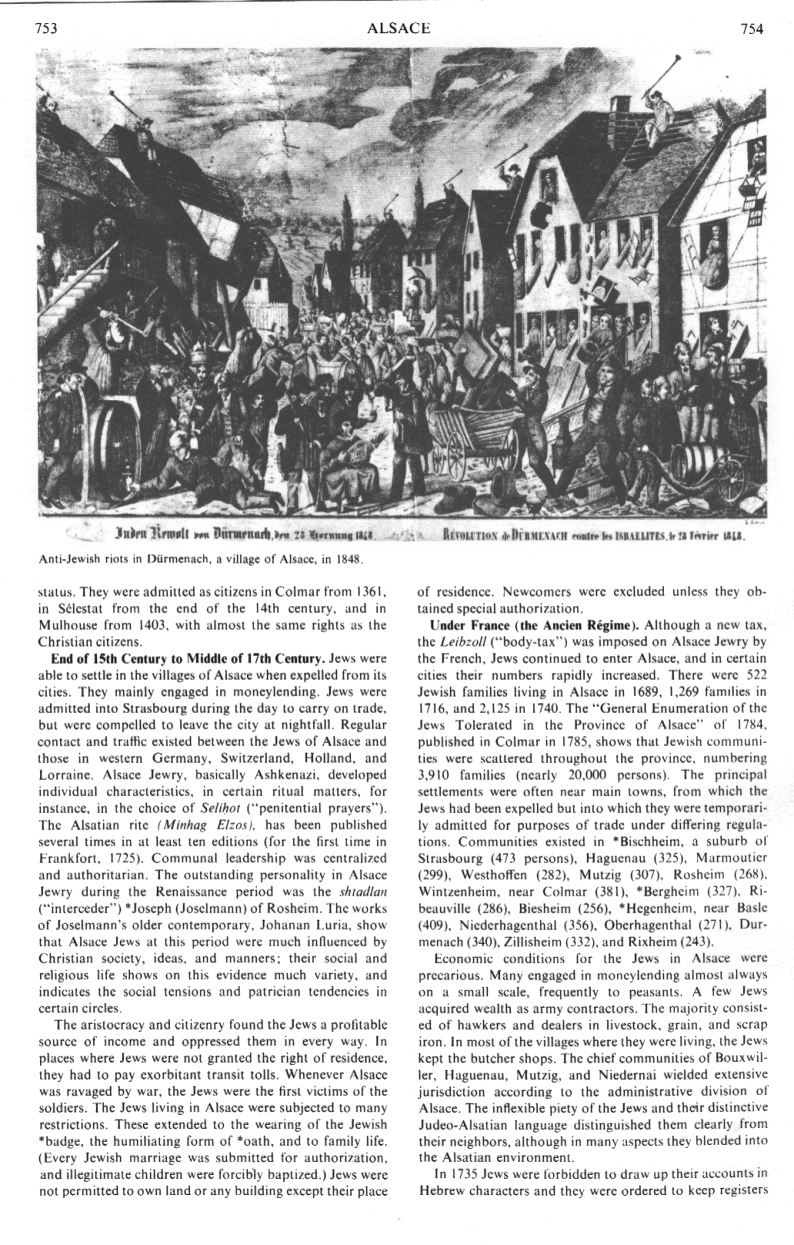Encyclopaedia Judaica (1971): Alsace, vol. 2, col. 753-754. Anti-Jewish riots in Duermenach, a village of Alsace, on 28 February