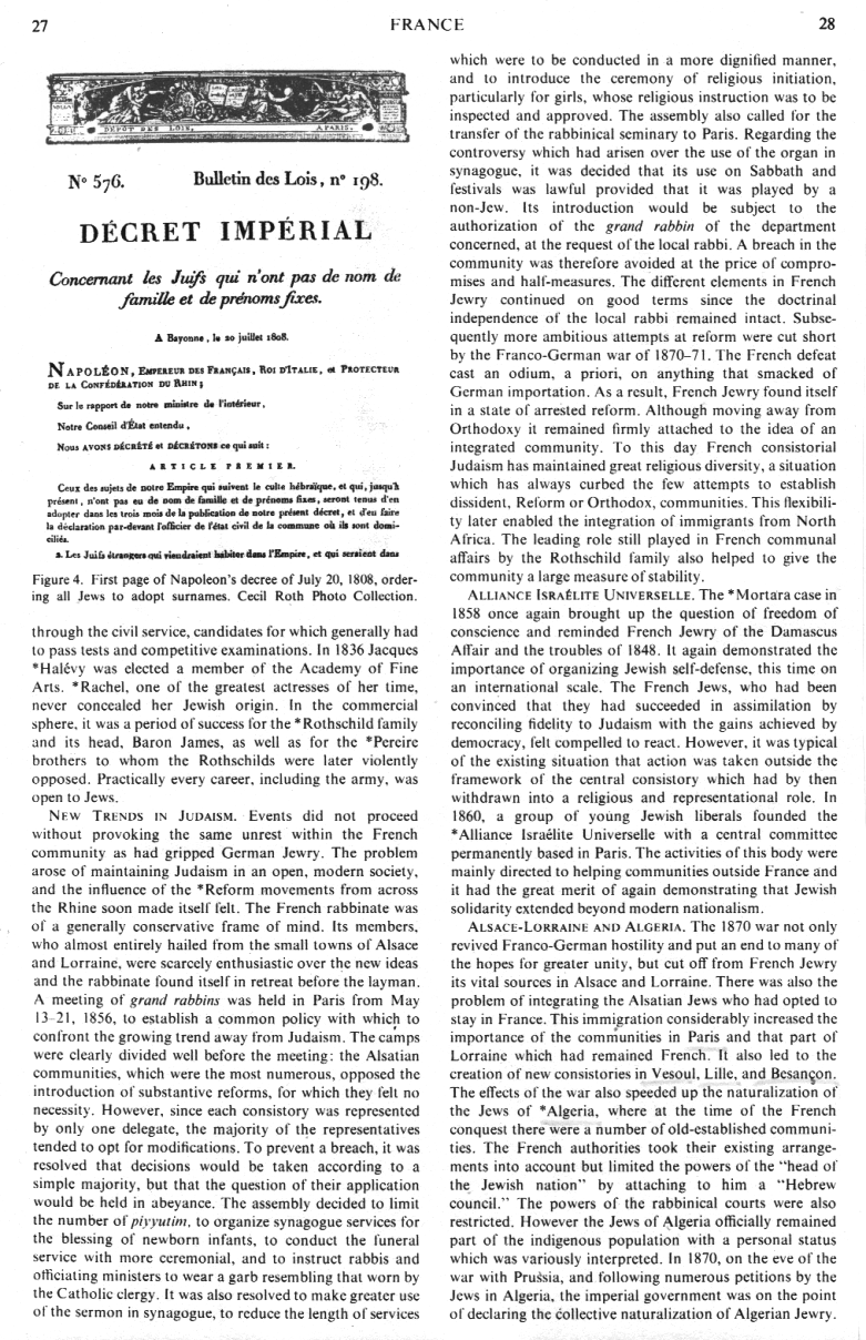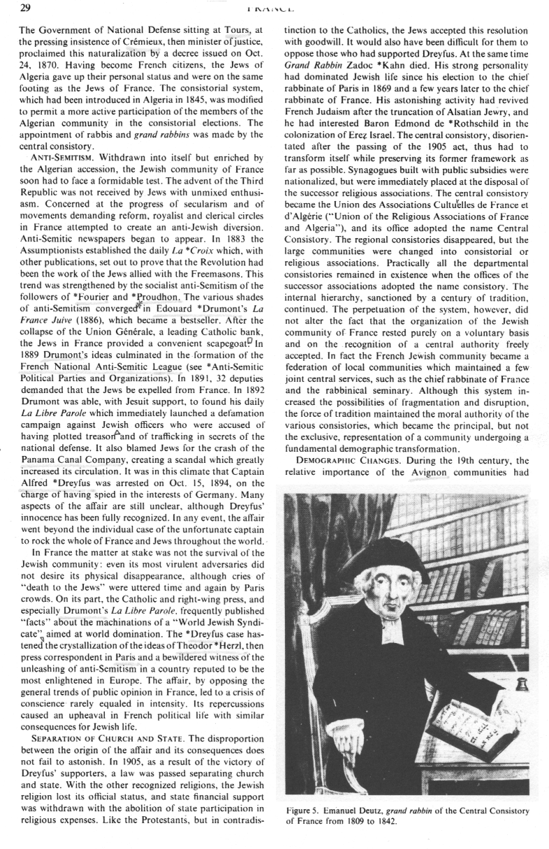 In fact the French Jewish community became a federation of local communities which maintained a few joint central services, such as the chief rabbinate of France and the rabbinical seminary. Although this system increased the possibilities of fragmentation and disruption, the force of tradition maintained the moral authority of the various consistories, which became the principal, but not the exclusive, representation of a community undergoing a fundamental demographic transformation. (col. 29)