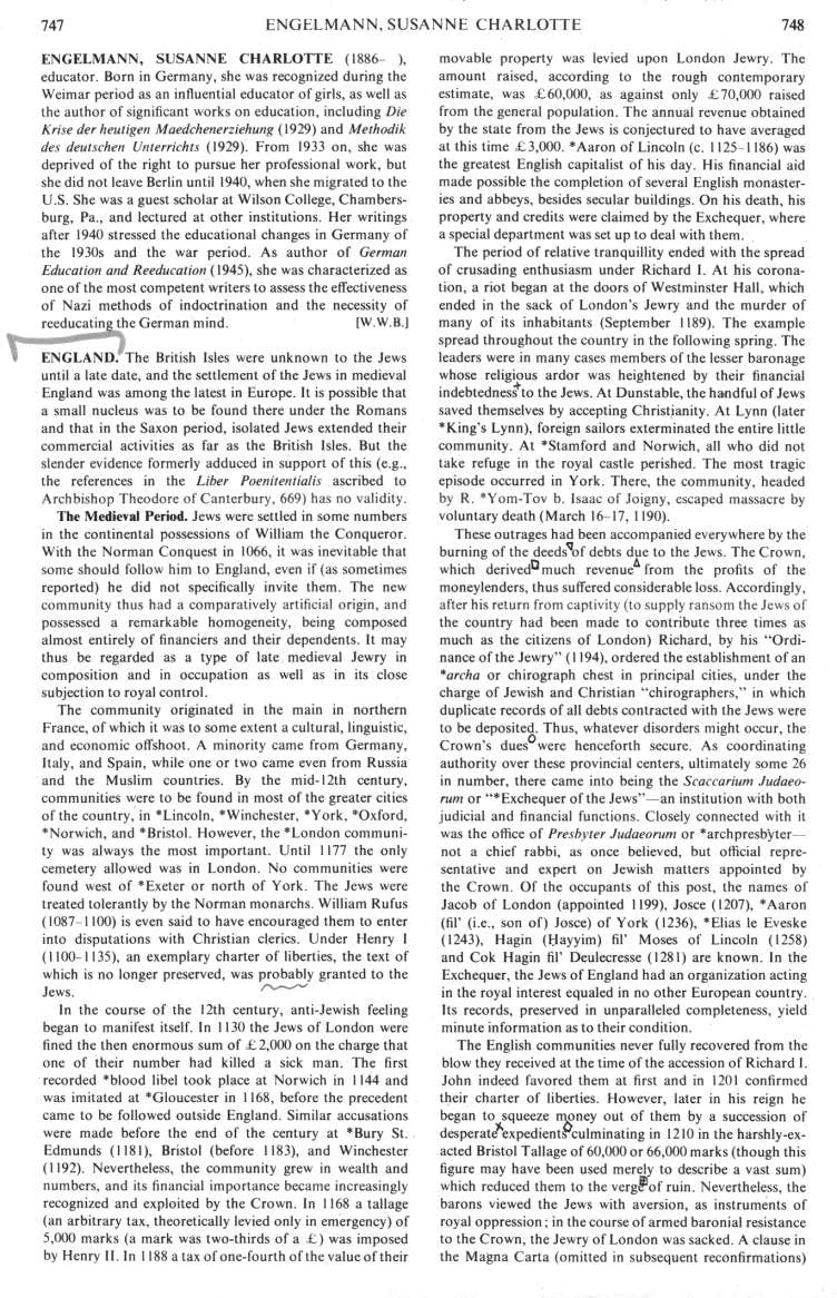 from: England; In: Encyclopaedia Judaica, vol. 6