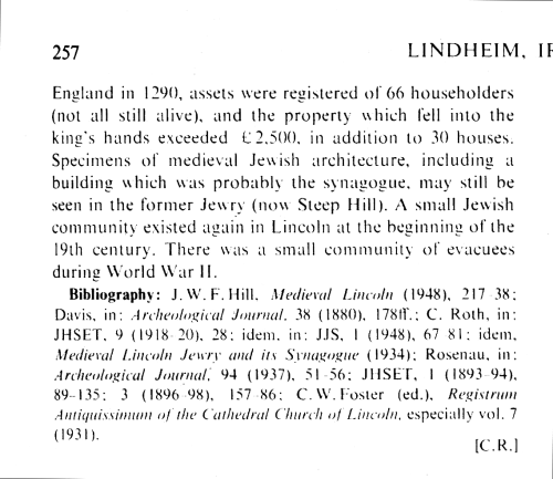 ![]() Encyclopaedia Judaica: Jews in Lincoln, vol. 11, col. 257 |