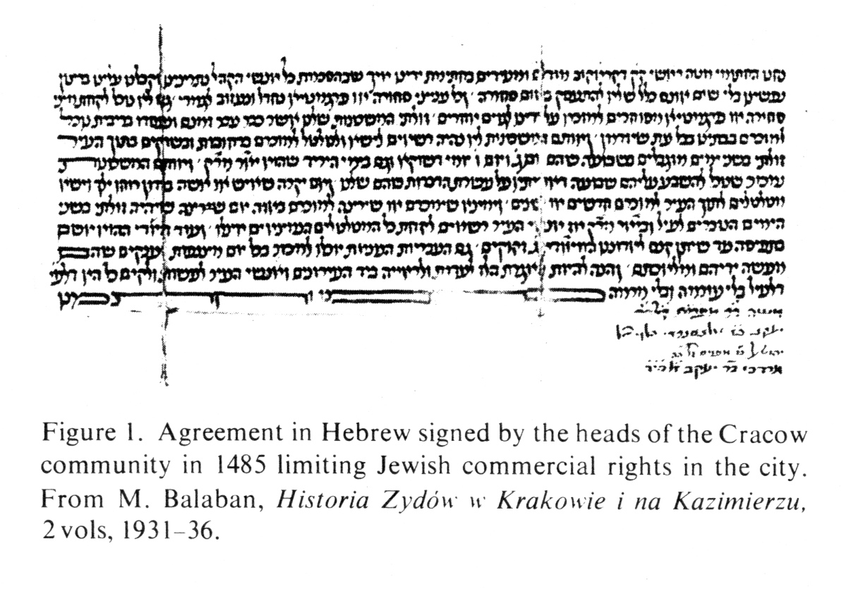 Encyclopaedia Judaica (1971): Cracow, vol. 5, col. 1029. Agreement in Hebrew signed by the heads of the Cracow community in 1485