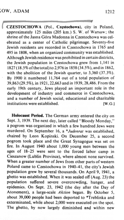 Encyclopaedia Judaica (1971): Czestochowa, vol. 5, col. 1212