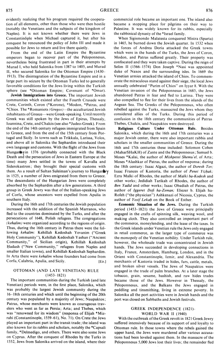 ![]() Encyclopaedia Judaica (1971): Greece, vol. 7, col. 875-876 |
