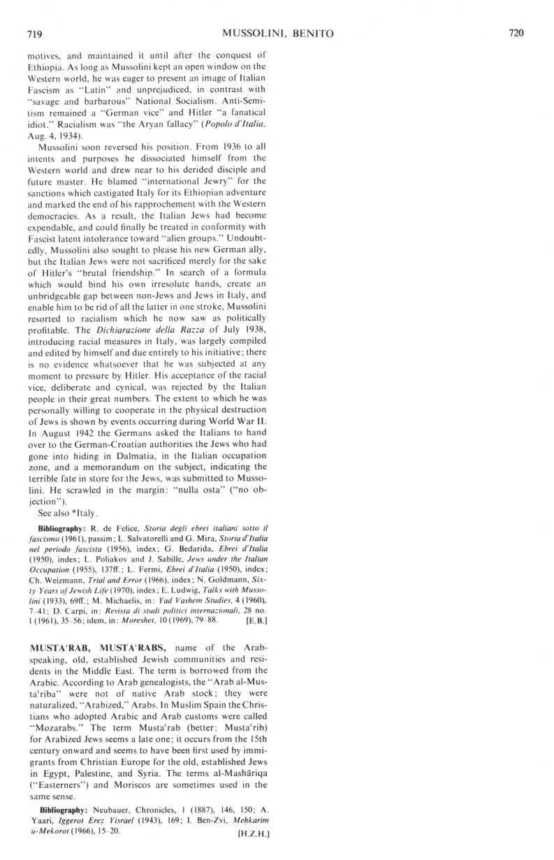 Encyclopaedia Judaica 1971: Mussolini, vol. 12, col. 719
