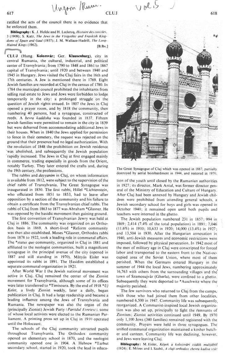 Encyclopaedia Judaica (1971): Jews in Cluj (Hung.