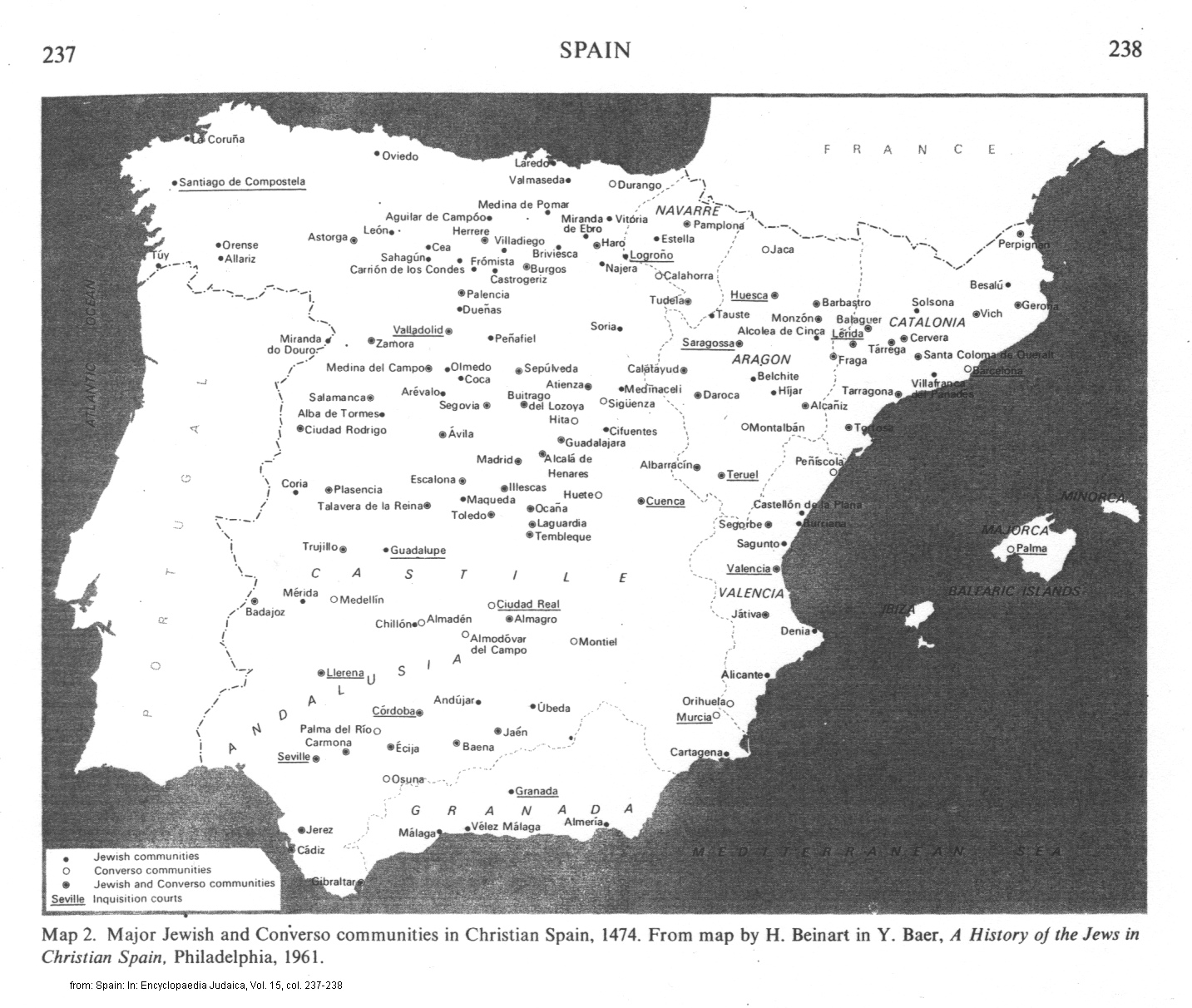 Encyclopaedia Judaica 1971: Spain, vol.15, col.237-238, map of the Jewish communities of 1474