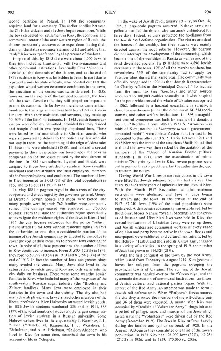 From 1906 to 1921 S. *Aronson was rabbi of Kiev; notable as *kazyonny ravvin ("government-appointed rabbi") were Joshua Zuckerman, the first to be appointed to this office, and S.Z. Luria. Between 1911 and 1913 Kiev was the center of the notorious *Beilis blood libel trial and the town was then racked by the agitation of the members of the *Union of Russian People ("Black Hundreds"). In 1911, after the assassination of prime minister *Stolypin by a Jew in Kiev, severe pogroms were on the point of breaking out there, but the authorities decided to restrain the rioters.