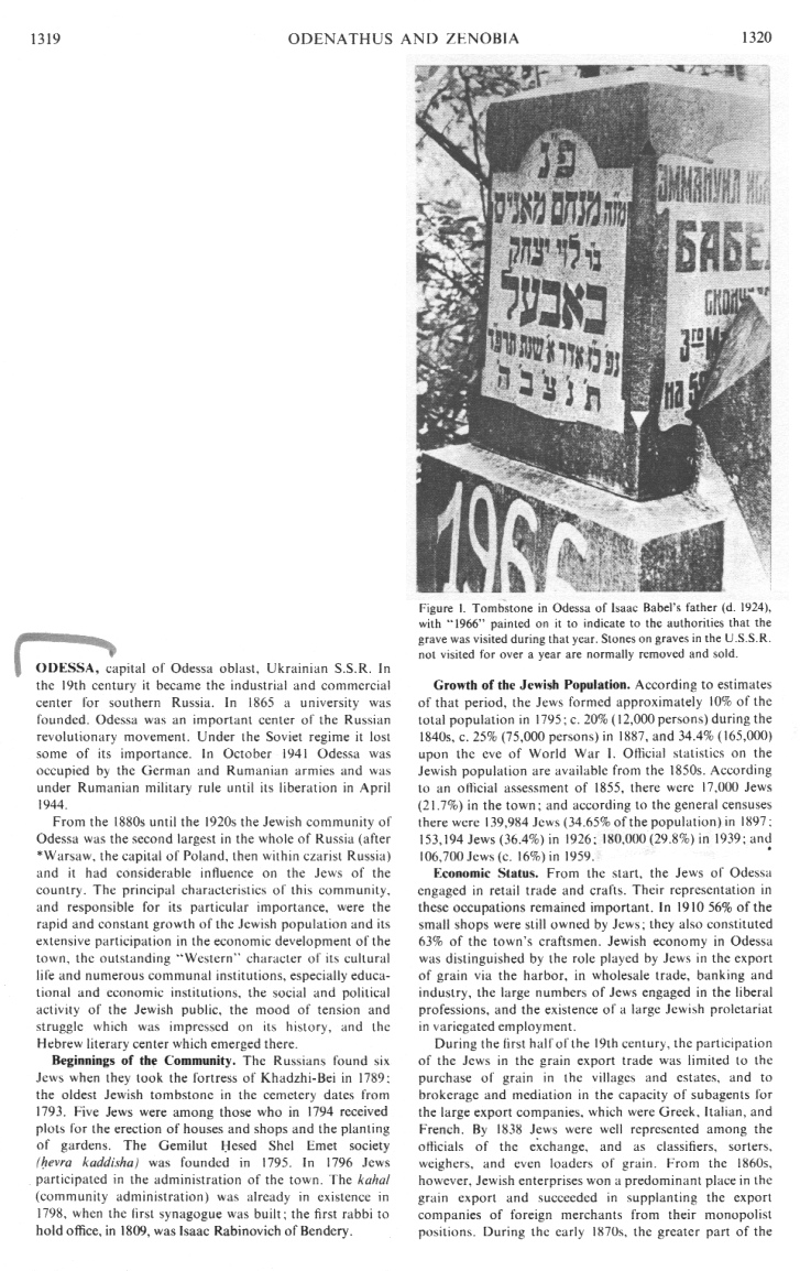 Encyclopaedia Judaica (1971): Odessa, vol.12, col.1320, gave stone of 1924, visited in 1966. Tombstone in Odessa of Isaac Babel's father (d. 1924), with "1966" painted on it to indicate to the authorities that the grave was visited during that year. Stones on graves in the U.S.S.R. not visited for over a year were normally removed and sold.