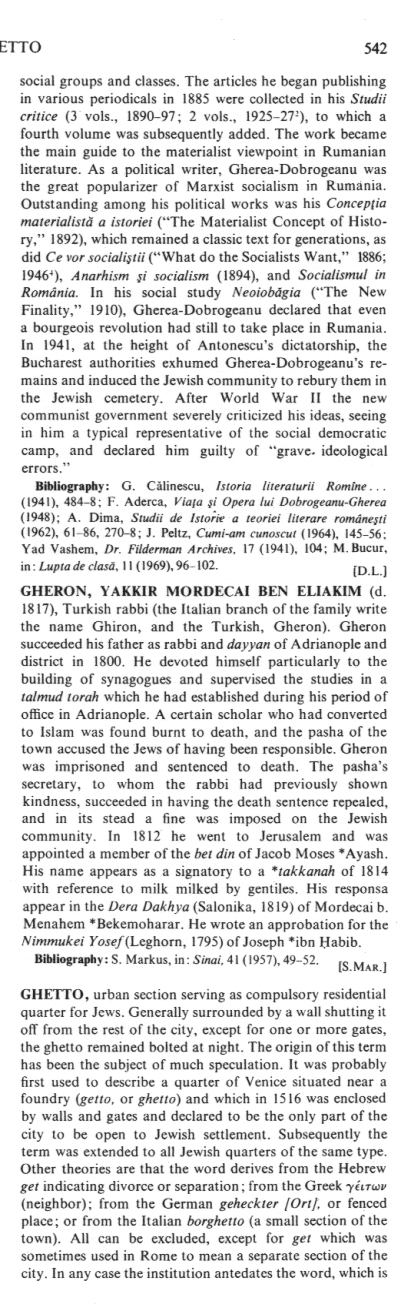 Alle können ausgeschlossen werden, mit Ausnahme von get, das manchmal in [[Jesus-Fantasie]]-Rom als Bezeichnung für einen separaten Stadtteil verwendet wurde. In jedem Fall ist die Institution älter als das Wort, das (Spalte 542)