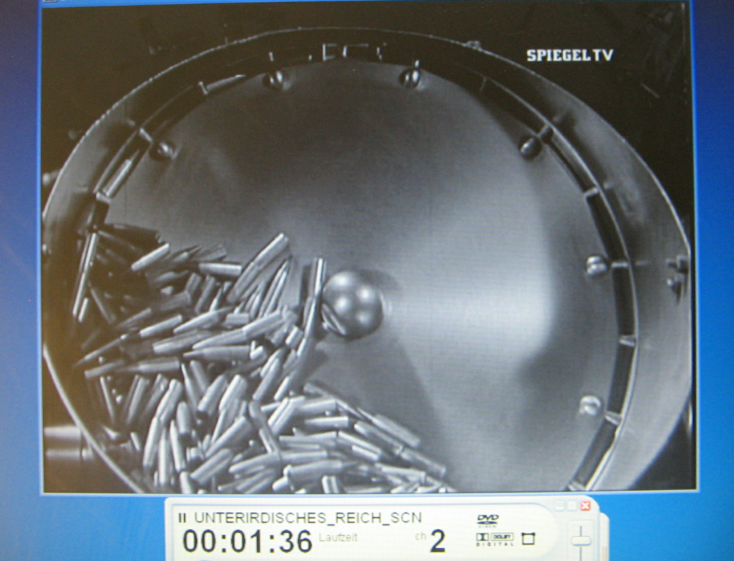Einleitung: Zwangsarbeiter stossen Trümmer 02Doch wie nah waren die Nazis dran am Erfolg des wahnwitzigen Projekts? Was wäre gewesen, wenn die Rüstungsproduktion unter Tage auf vollen Touren gelaufen wäre? Hätte Hitlers Vernichtungskrieg noch Millionen weitere Opfer gefordert? [Bilder: Stollen, Rüstungsproduktion, z.B. Patronen; ausbetonierte Halle].