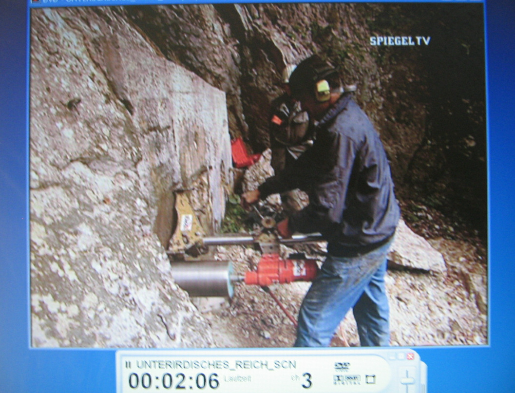 [Bild: Öffnung der Betonmauer vor dem Eingang mit Zylinderbohrungen im Kreis angeordnet, so dass am Ende ein grosses Stück herausfällt und ein Loch entsteht].