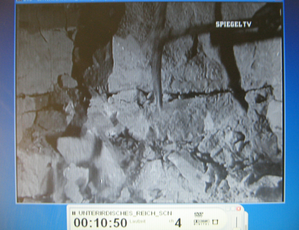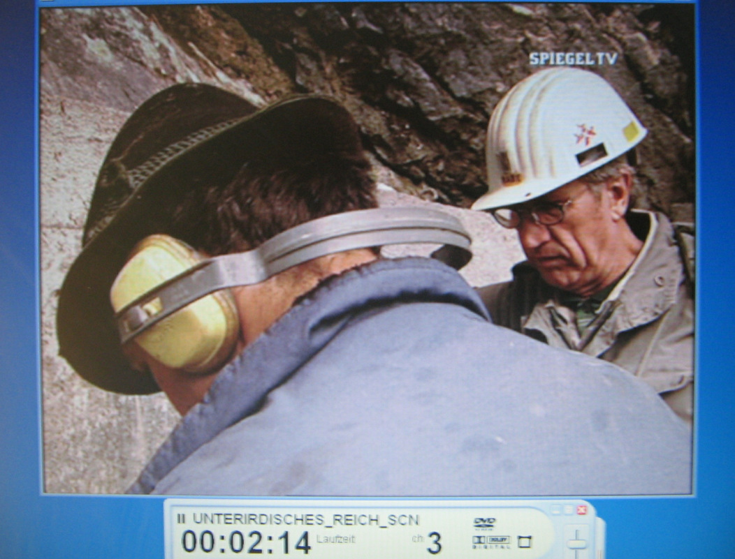 "Die Anlage gehörte der Messerschmitt AG während des Krieges und diente als bombensichere Fertigungs- und Entwicklungsstelle für den Flugzeugbau. Den Plänen nach gab es hier 3 oder 4 Zugänge in die Anlage. Einen haben wir jetzt wieder geöffnet, die restlichen wurden bei Kriegsende zugesprengt. Und es sind hier zwei handparallele Stollen von ungefähr 80, 90 m Länge, die durch Querstollen verbunden sind, die dann als Fertigungs- und bombensichere Produktionsstätten dienten." [Bild: ehemalige Produktionshalle im Berg; Stollen im Rohbau]