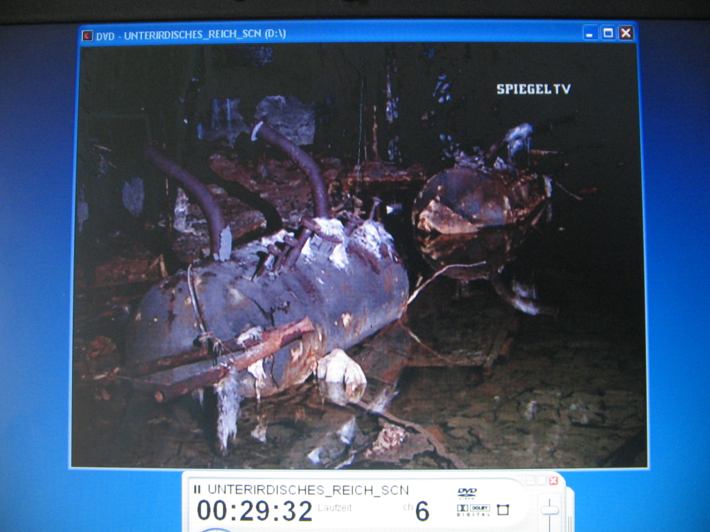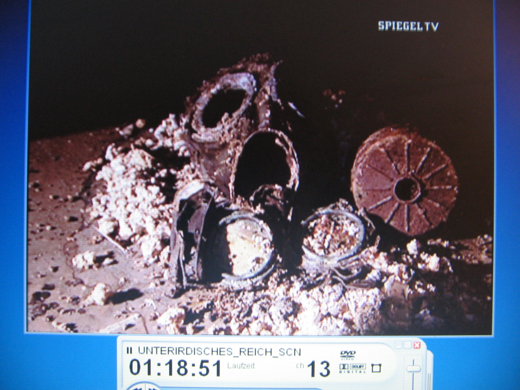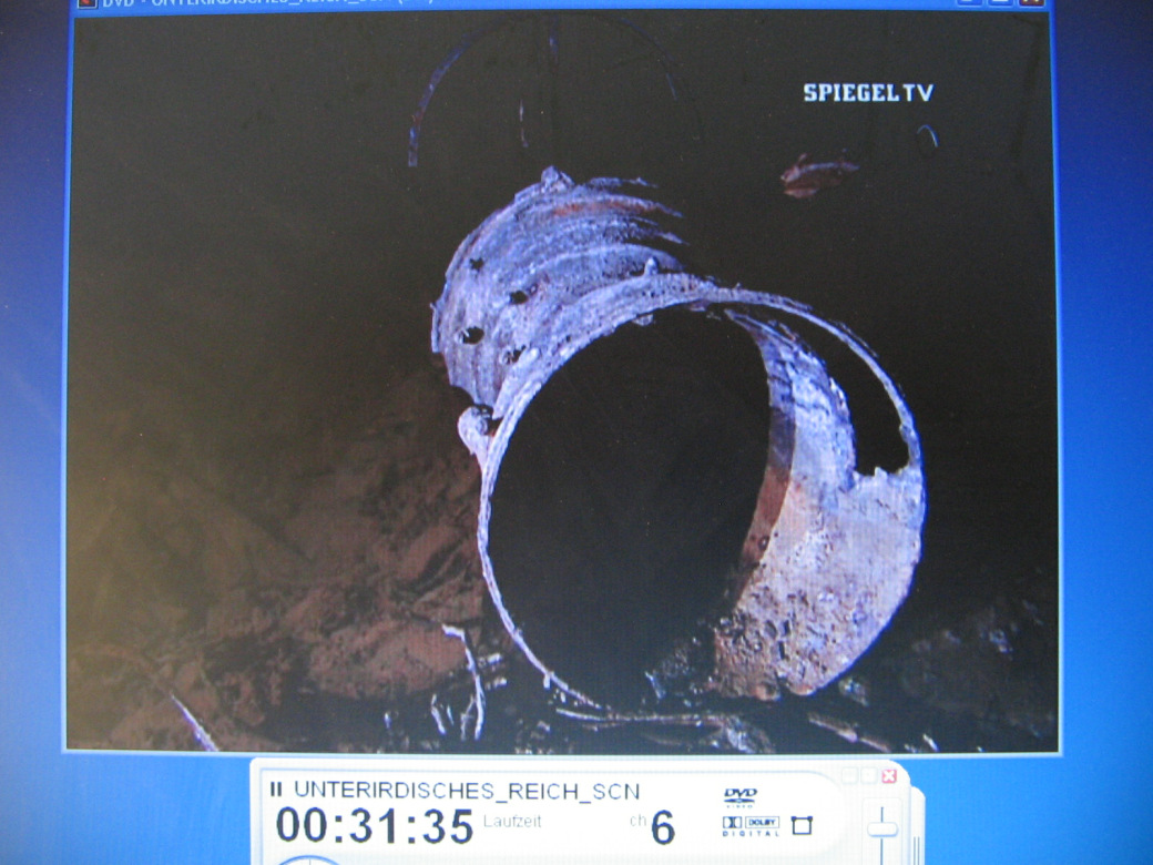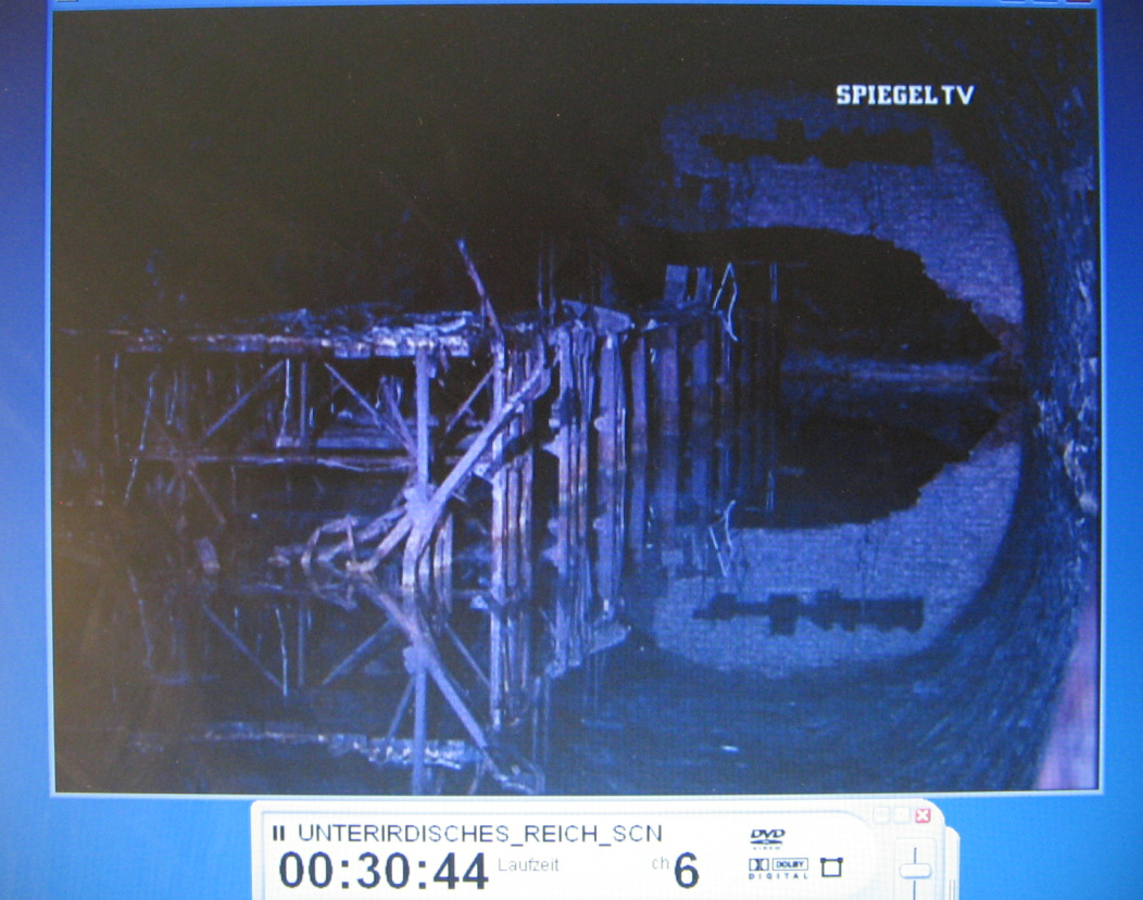 Es war eines der gigantischsten Bauvorhaben der Menschheitsgeschichte: Bombensichere Produktionsstätten für das Dritte Reich [Bild: Raketenrest im überschwemmten Stollen].