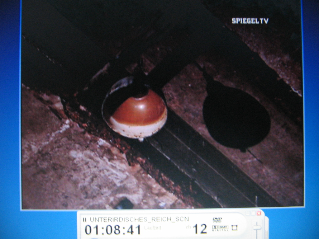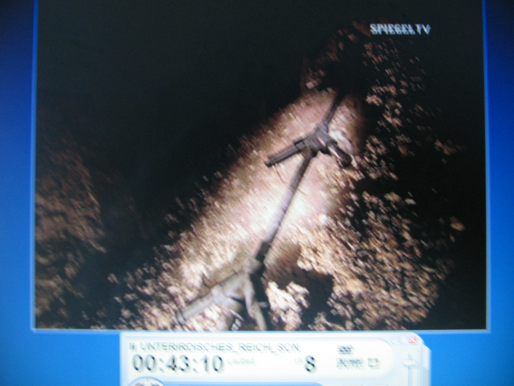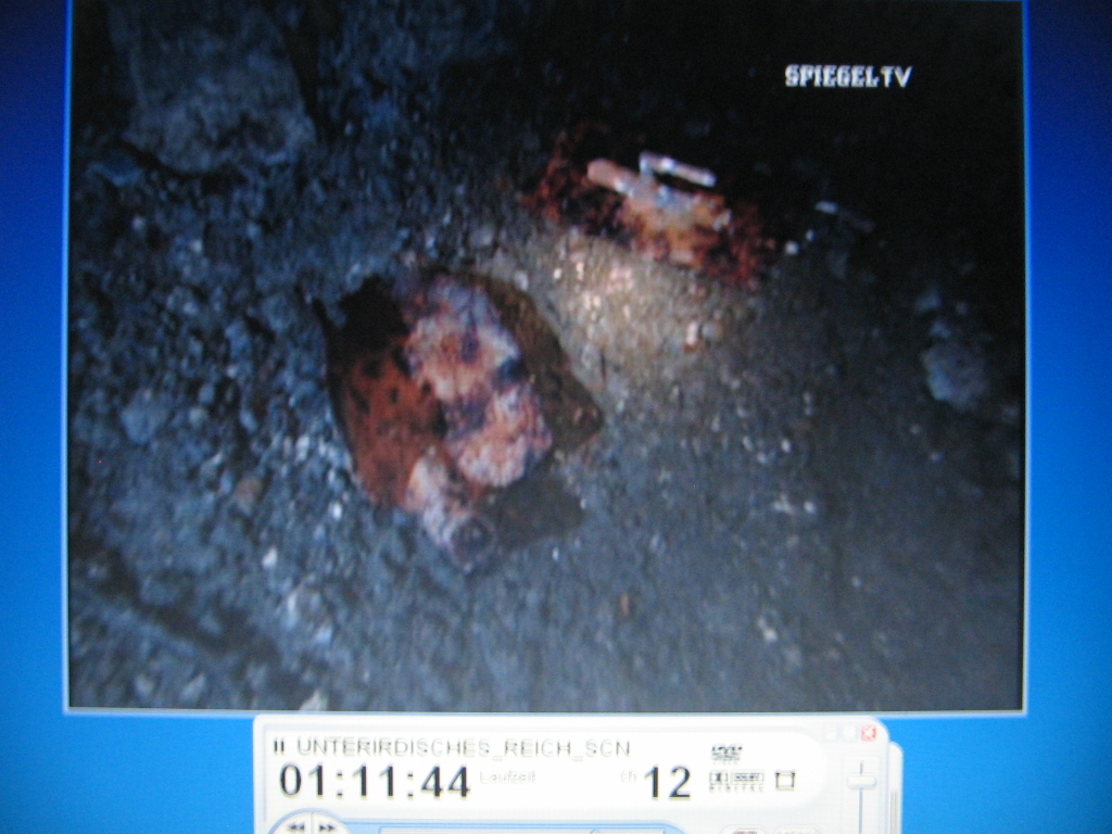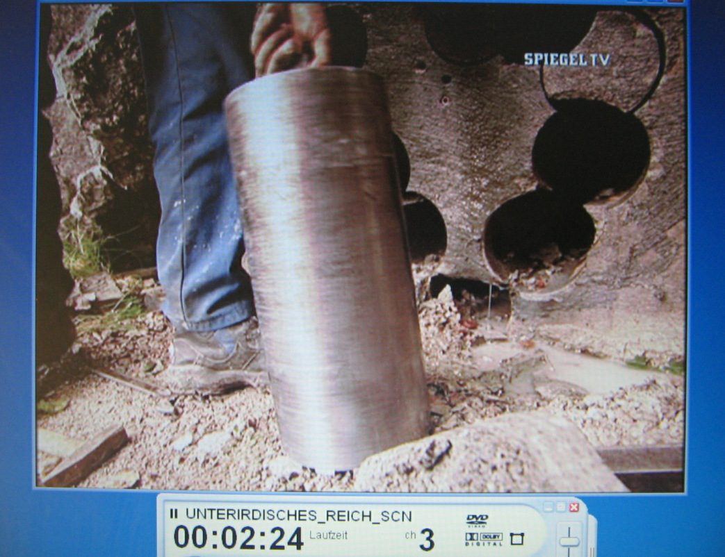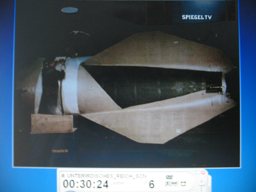 Es war eines der gigantischsten Bauvorhaben der Menschheitsgeschichte: Bombensichere Produktionsstätten für das Dritte Reich [Bild: Raketenrest im überschwemmten Stollen].