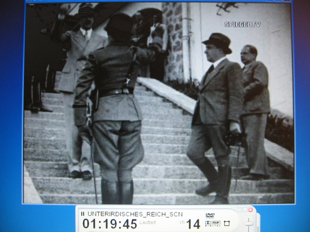[Bild: Hitler mit Gefolge in den Bauten auf dem Obersalzberg, Wachen mit Hitler-Gruss]