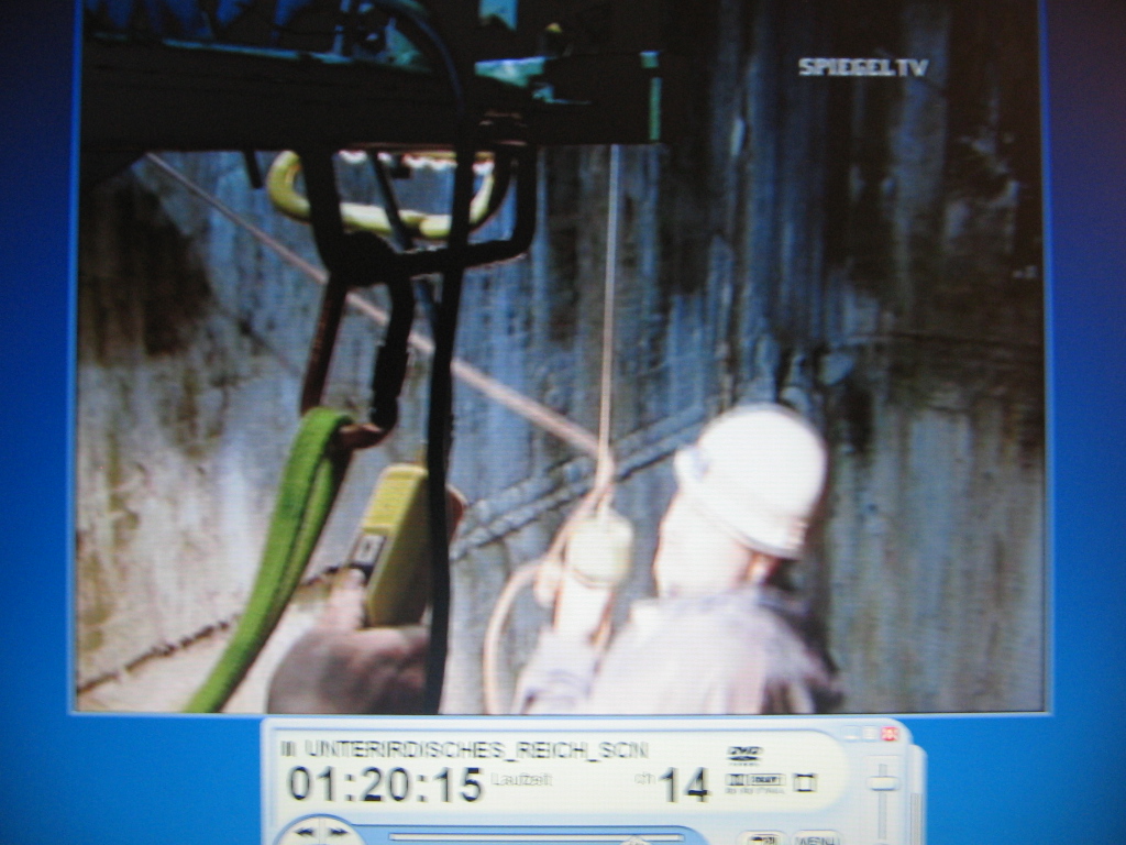 Obersalzberg-Berghof 12, Abseilen in einen Schacht 03Mit einem kompliziert gesicherten elektrischen Abseil-Aufzug werden Team und Ausrüstung vorsichtig heruntergelassen. Am Fuss des Schachts vermuten die Experten den Eingang zu einer halbfertigen Bunkeranlage der SS.
