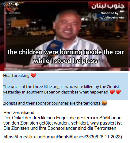 9.10.2023 alle Palästinenser als "menschliche Tiere" (Video-Link).