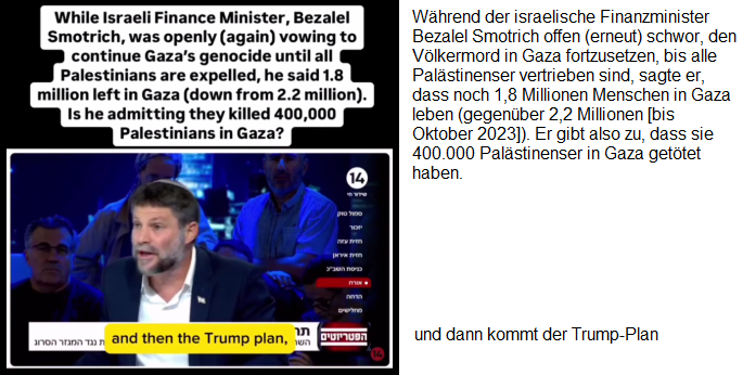 -- der Nazi-Zion-Finanzminister Smotrich verkündet, es leben noch 1,8 Millionen Palästinenser im Gazastreifen-KZ, wie die Zahl zustandekommt, ist ihm EGAL