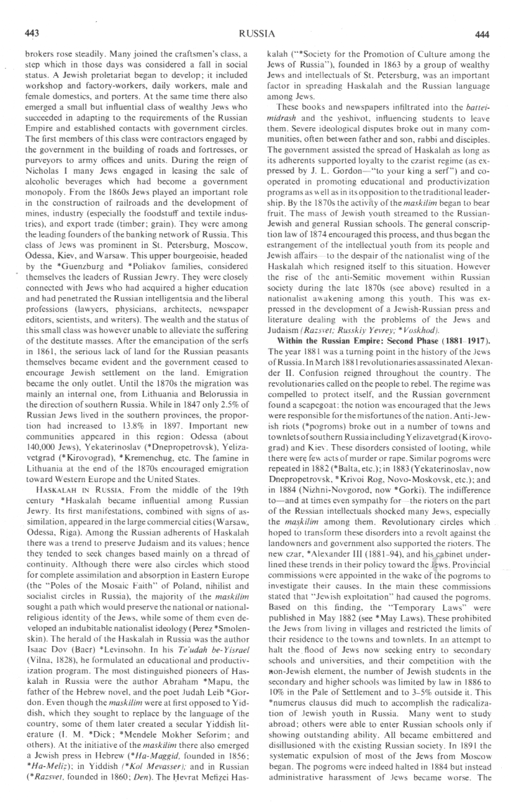 This was expressed in the development of a Jewish-Russian press and literature dealing with the problems of the Jews and Judaism (Razsvet; Russkiy Yevrey; *Voskhod).> (col. 444)
