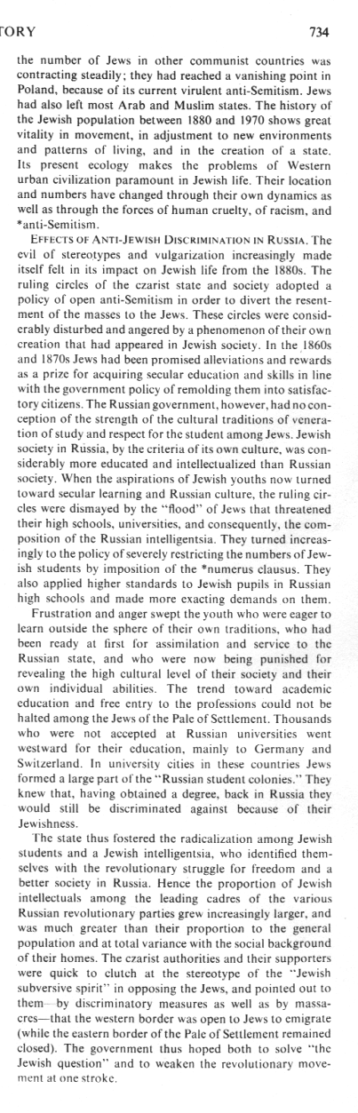 The state thus fostered the radicalization among Jewish students and a Jewish intelligentsia, who identified themselves with the revolutionary struggle for freedom and a better society in Russia. Hence the proportion of Jewish intellectuals among the leading cadres of the various Russian revolutionary parties grew increasingly larger, and was much greater than their proportion to the general population and at total variance with the social background of their homes. The [[criminal racist "Christian"]] authorities and their supporters were quick to clutch at the stereotype of the "Jewish subversive spirit" in opposing the Jews, and pointed out to them - by discriminatory measures as well as by massacres - that the western border was open to Jews to emigrate (while the eastern border of the Pale of Settlement remained closed). The government thus hoped both to solve "the Jewish question" and to weaken the revolutionary movement at one stroke. (col. 734)