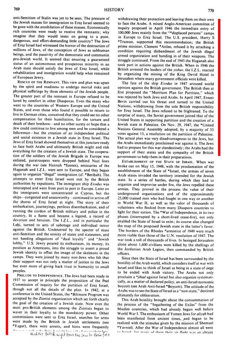 On Nov. 29, 1947, the *United Nations General Assembly adopted, by a majority of 33 votes against 13, a resolution on the partition of Palestine. The actual plan was very disadvantageous to the [[Fantasy]] Jews, but the Arab [[Fantasy Muslims]] immediately proclaimed war against it. The [[Fantasy]] Jews had to prepare for this war clandestinely; the Arab [[Fantasy Muslims]] had the support of their states and the sympathy of the British government to help them in their preparations.> (col. 770)