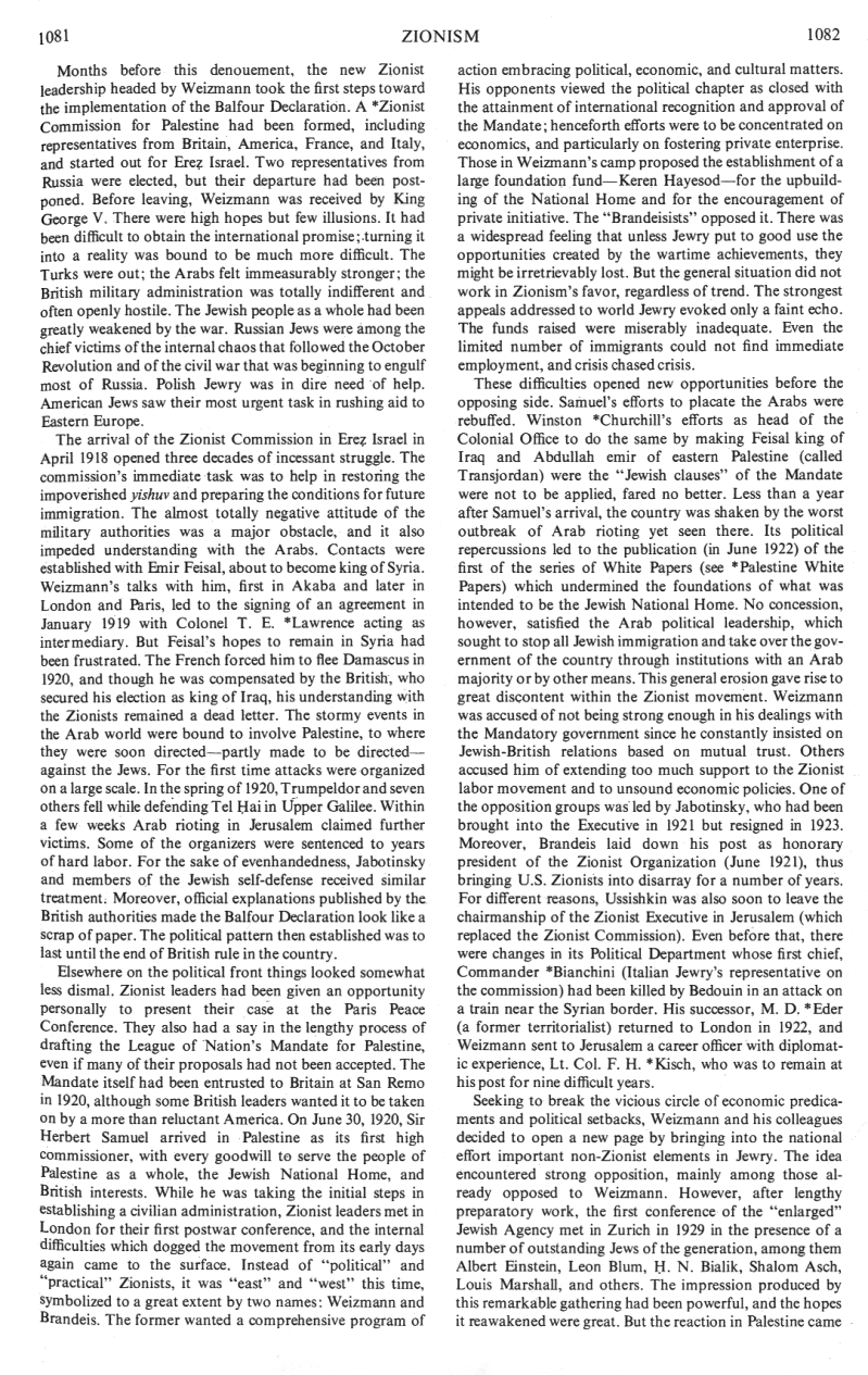 Elsewhere on the political front things looked somewhat less dismal. [[racist Fantasy]] Zionist leaders had been given an opportunity personally to present their case at the Paris Peace Conference. They also had a say in the lengthy process of drafting the League of Nation's Mandate for Palestine, even if many of their proposals had not been accepted.> (col. 1081)