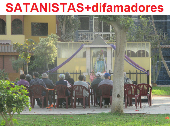 Ejemplo del terrorismo cacólico (católico) en Lima Los Olivos: ocupan un parque (parque Los Ángeles) con una caja con vídrios con una "virgen santa" adentro, todo es solo satanismo con una prohibición de sexo para mujeres jóvenes [4] - primer plano [5] - y esa manera de ocupar parques es normal en el Perú, ¡ocupan sus parque son satanismo!Los católicos criminales crean grupos de propaganda contra las personas que dicen la verdad sobre el mundo y sobre el Vaticano. Todos los días escucho a los católicos difamadores como me difaman en mi casa cada día. Una formación adicional NO es prevista porque la palabra "formación adicional" no está en la Biblia. Han alojado una pareja misionera debajo de mi piso y piensan que eso vaya a mejorar las mentiras de la Biblia (!). Al mismo tiempo, los católicos criminales siempre repiten las mentiras de los servicios secretos, SIN volver a preguntar. Con eso los cacólicos (católicos) difamadores impiden muchas curaciones y dejan sufrir y MORIR su gente a propósito.