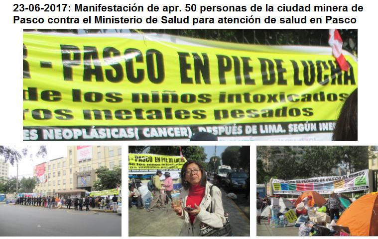 Gente de Cerro de Pasco han protestado en Lima en la entrada del Ministerio de Salud que no les importan los niños de plomo de Cerro de Pasco. El sábado pasado, 24 de junio de 2017, yo quería iniciar curaciones con bicarbonato de sodio con ellos, pero la mafia católica evitó la curación de los niños de plomo en el Ministerio de Salud en Lima. A los representantes de Cerro de Paso fue prometido un bello hospital y una clínica especial y mandaron la gente a su casa. Pero la arquitectura del hospital y de la clínica especial seguramente serán de la arquitectura de la costa caliente. Entonces hará frío en el hospital o en la clínica especial y saldrán entre 0 y 5 grados de temperatura como en el hospital de La Oroya. Pero el remedio curativo con soda + vinagre de manzana ha llevado a la gente a Cerro de Pasco, y por eso es posible que aún haya curaciones rápidas.