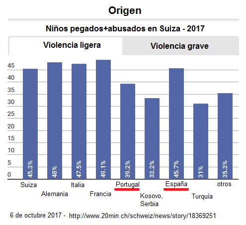 [37] Gráfico con la estadística de los pegalones y pegalonas que pegan niños en Suiza cr. 2017: padres "cristianos" católicos de Portugal y de España cometen el máximo de violencia grave contra niños: http://www.20min.ch/schweiz/news/story/18369251