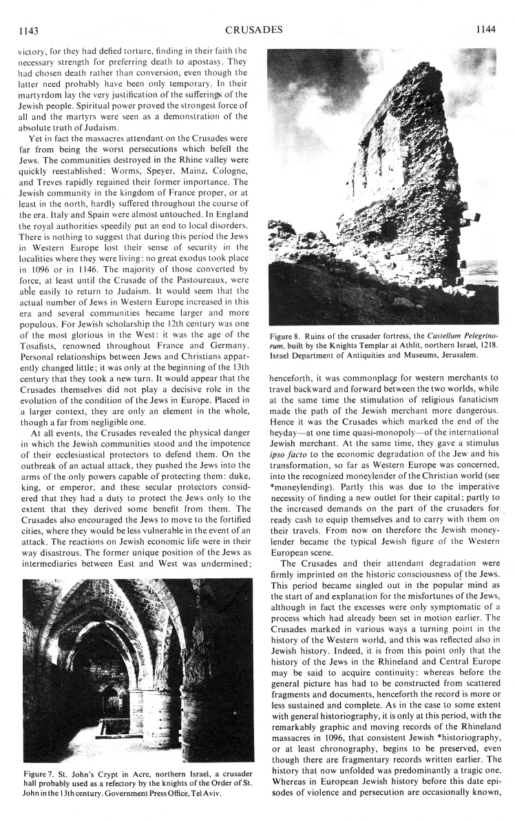 Encyclopaedia Judaica: Crusades, vol. 5, col. 1143: Ruins of the crusader fortress Castellum Pelegrinorum, built by the Knights Templar at Athlit, northern Israel, 1218. Israel Department of Antiquities and Museums, Jerusalem.
