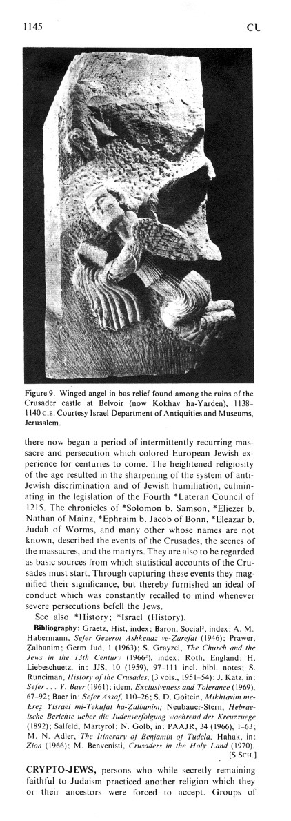Encyclopaedia Judaica: Crusades, vol. 5, col. 1145: Winged angel in bas relief found among the ruins of the Crusader castle at Belvoir (now Kokhav ha-Yarden), 1138-1140 C.E. Courtesy Israel Department of Antiquities and Museums, Jerusalem