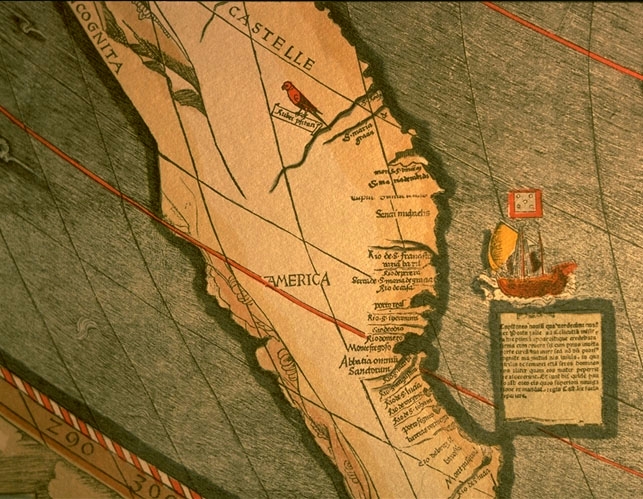 Waldseemüller meint, man habe die historische Pflicht, den neuen Kontinent nach seinem weissen spanischen "Entdecker" Amerigo Vespucci zu benennen. Damit verdrängt er bisherige Bezeichnungen der portugiesischen Kolonialgeschichte, wie