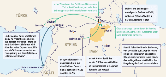 Im August berichtete die Financial Times, dass Israel bis zu 75 Prozent seiner Öllieferungen aus Irakisch-Kurdistan beziehe. [3] Mehr als ein Drittel dieser Exporte soll über den Hafen Ceyhan laufen; die Financial Times bezeichnet den Hafen als „ein Gateway für geschmuggeltes Rohöl aus den vom ‚[Fantasie]-islamischen Staat‘ besetzten Gebieten“.