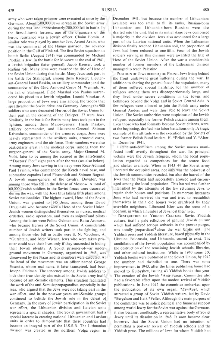 The majority of the surviving Jews spoke Russian. There were over two million of them, and the Soviet authorities sought to bring about their complete assimilation.> (col. 481)