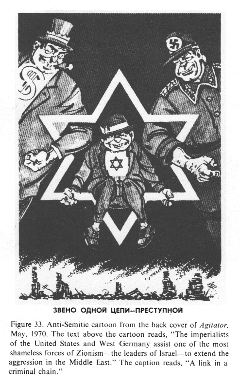A deep distrust of the Jew pervaded the atmosphere in the Soviet Union. Jews were considered an alien element bound by family, historical, and spiritual bonds to the State of Israel and to Jews in the United States and other countries. They were strictly barred from the higher echelons [[ranks]] of the ruling Communist Party,from the foreign service and senior military command; similarly, their proportion among elected representatives to the central and local Soviets has diminished, and clandestine police supervision has been imposed on the synagogues and on individuals meeting with visiting Jews from abroad.