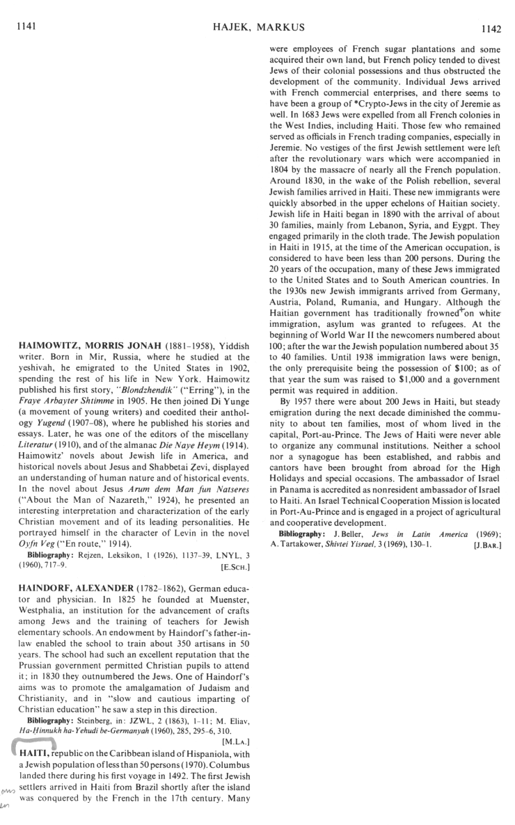 Encyclopaedia Judaica 1971: Haiti, vol. 7, col. 1141-1142