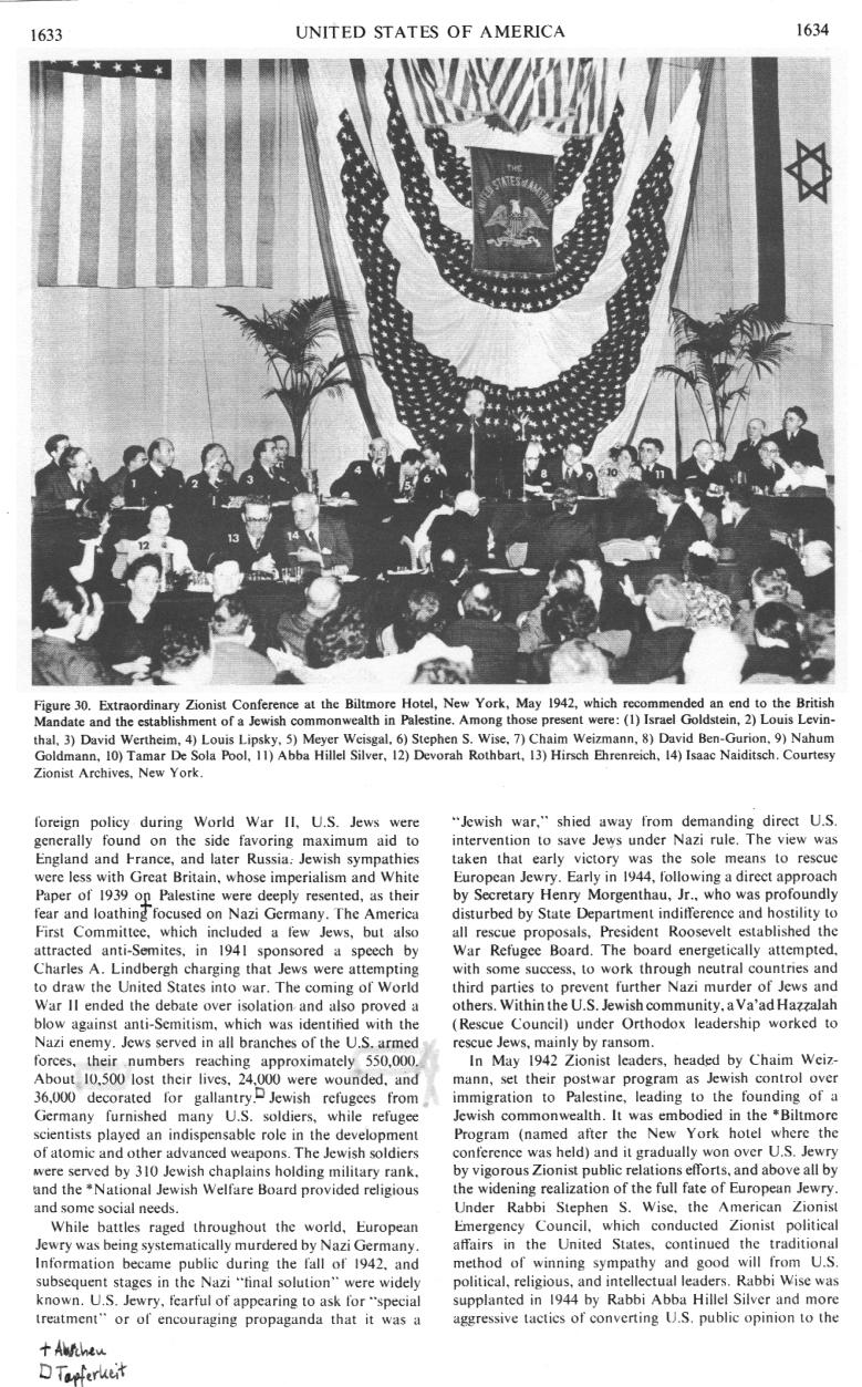 [[racist]] Zionist program and applying its continuous pressure to the makers of U.S. foreign policy were adopted. The representative *American Jewish Conference in 1943, swayed by Silver's oratory, rejected a compromise demanding only free Jewish immigration to Palestine and adopted the Biltmore Program. On two occasions, early in 1944 and late that year and early in 1945, the House of Representatives Foreign Affairs Committee was about to pass resolutions endorsing the Jewish commonwealth with every prospect for early passage in both houses of Congress, when the War Department, at the request of the State Department, succeeded in having them tabled as "prejudicial" to the war effort. (col. 1635) [[...]]