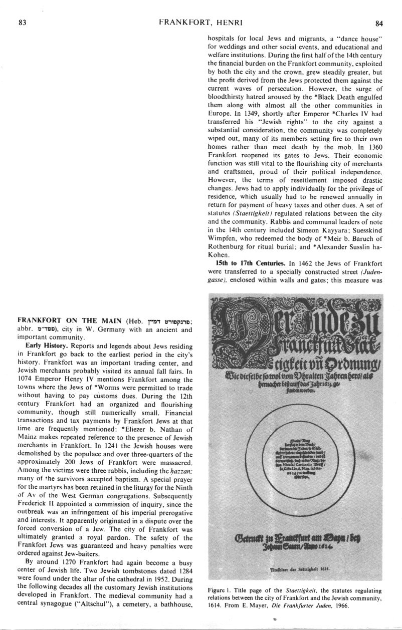 Encyclopaedia Judaica (1971): Frankfort on the Main, vol. 7, col. 84, title page of the "Staettigkeit", the statutesregulating relations