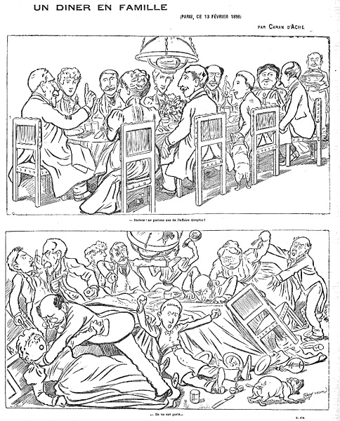 Cartoon: The family is peaceful when there is no conversation about Dreyfus. Second picture: They have spoken about Dreyfus and family war is developing. Cartoon by the cartoonist Caran d'Ache in the newspaper "Le Figaro", 14 Feb. 1898.