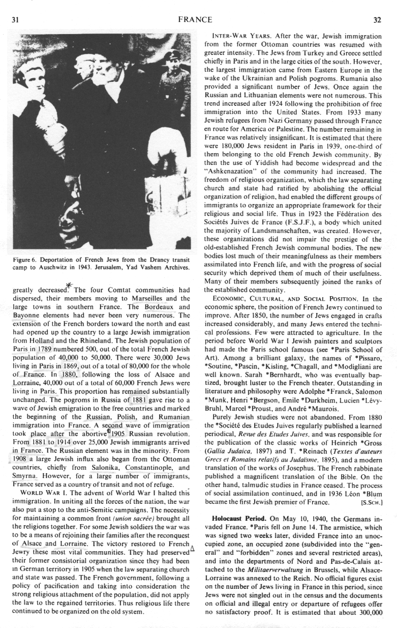 From 1933 many Jewish refugees from Nazi Germany passed through France en route for America or Palestine. The number remaining in France was relatively insignificant. (col. 32)