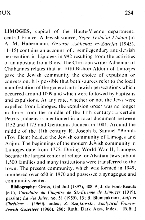 ![]() Encyclopaedia Judaica (1971): Jews in Limoges, vol. 11, col. 254 |